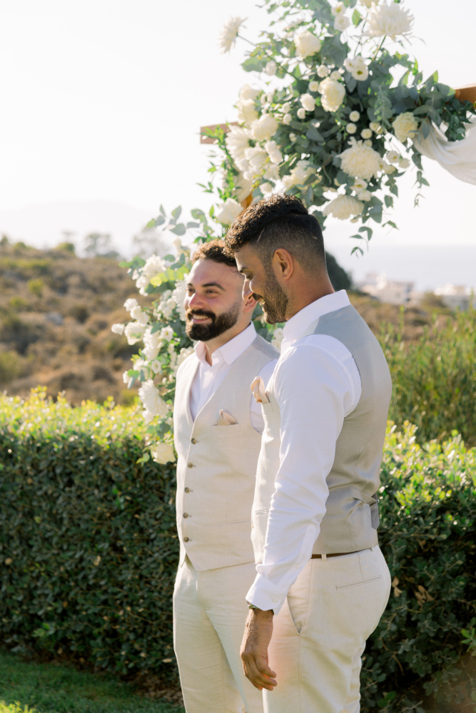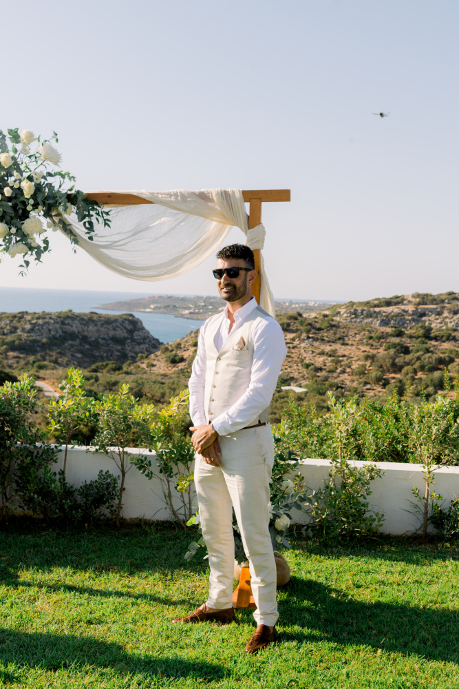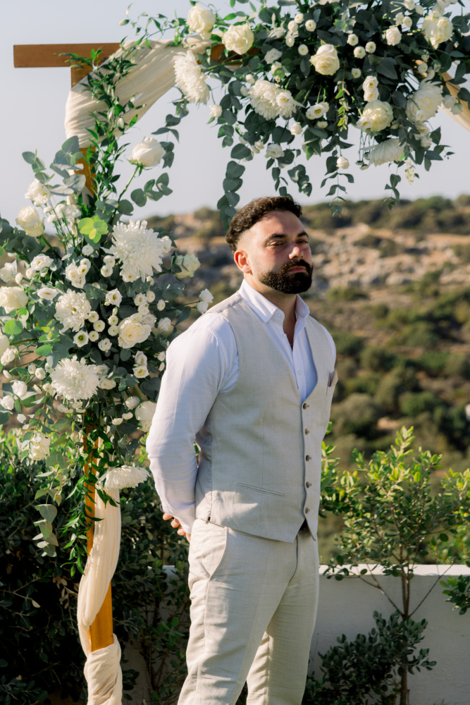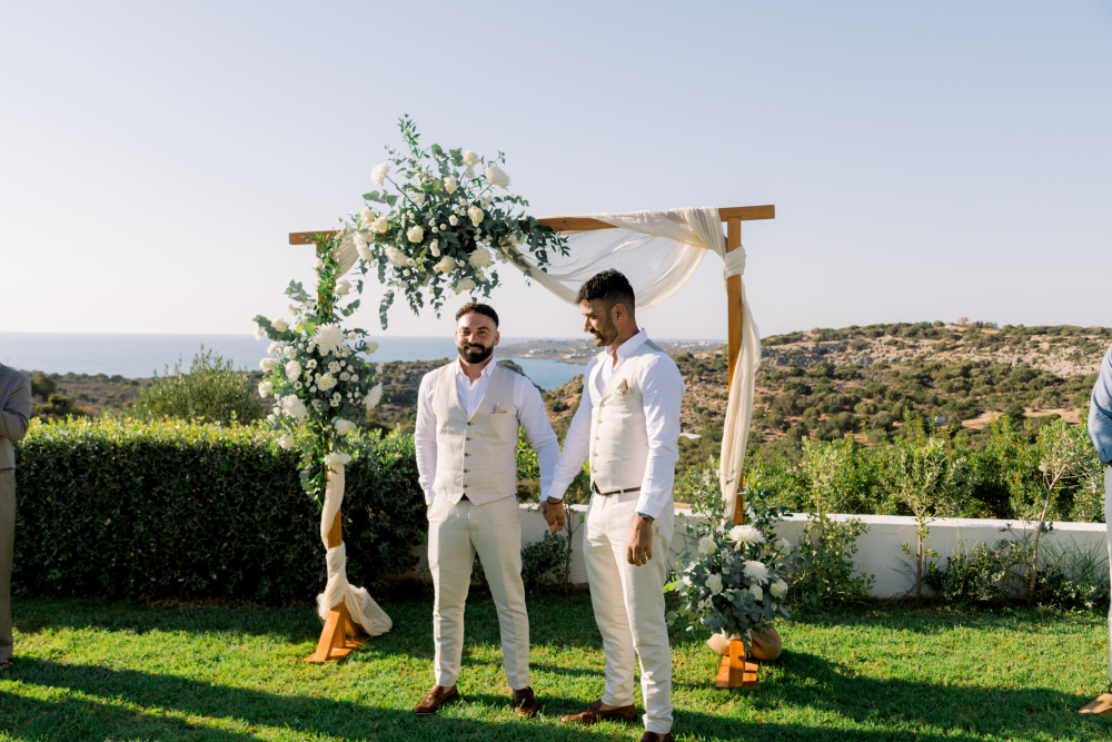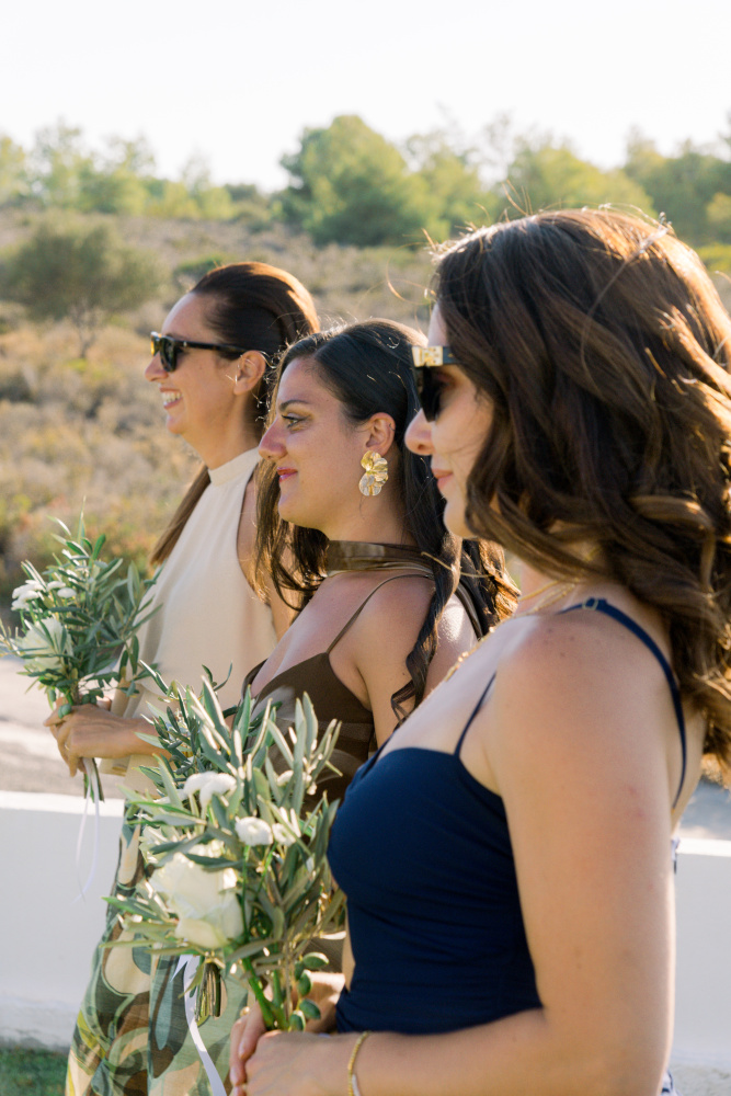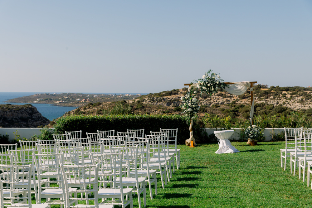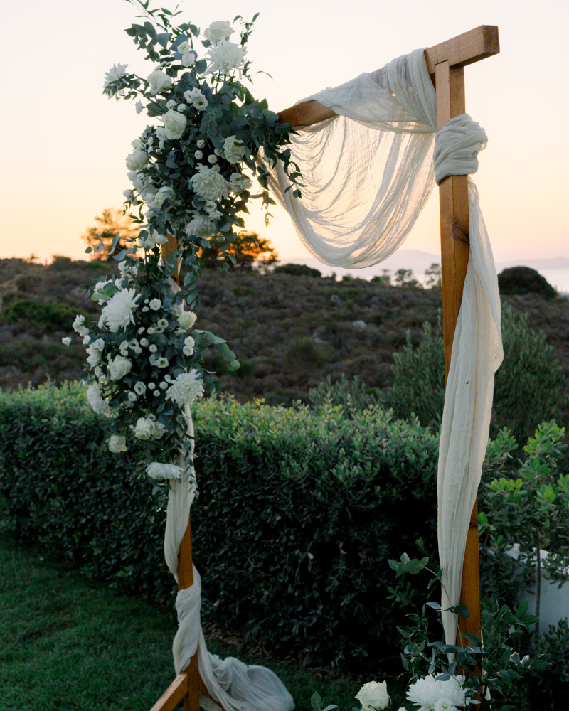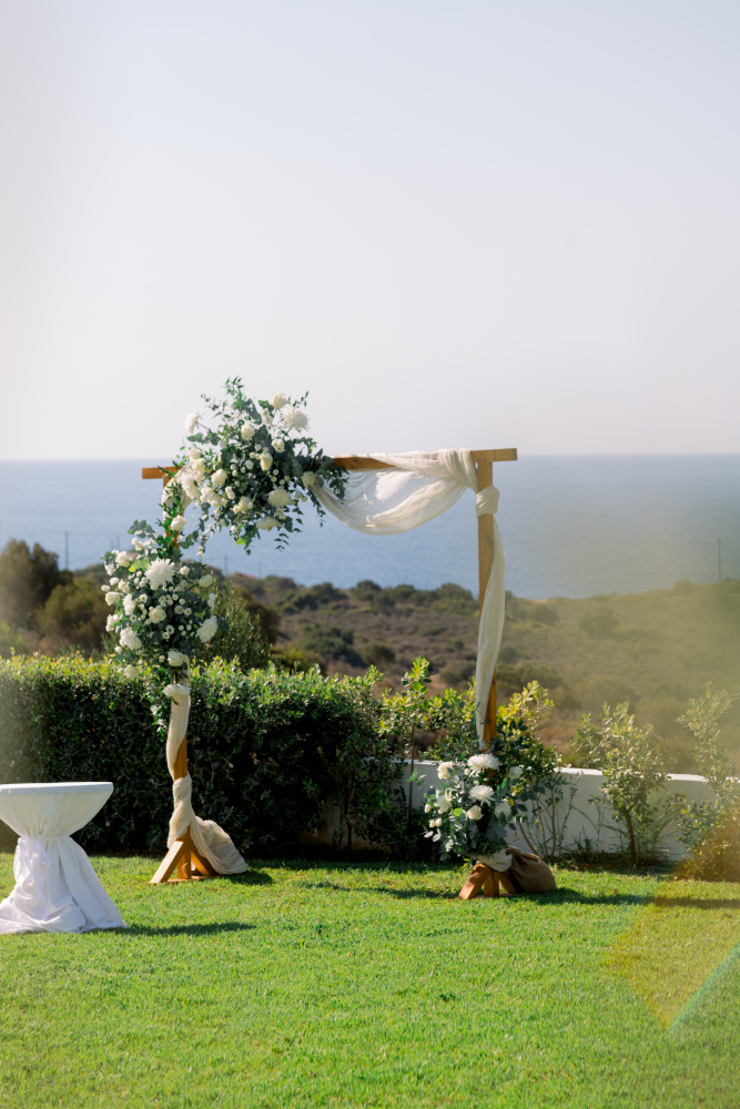 Their ceremony unfolded at Ktima Reveli, framed by sweeping sea views and soft coastal light. Under an elegant floral arch,