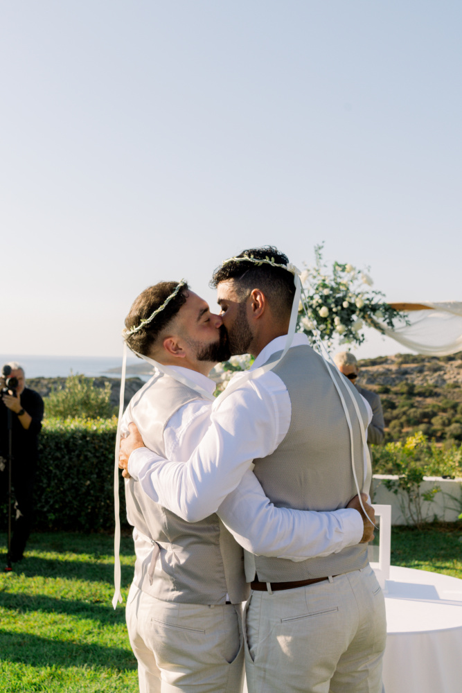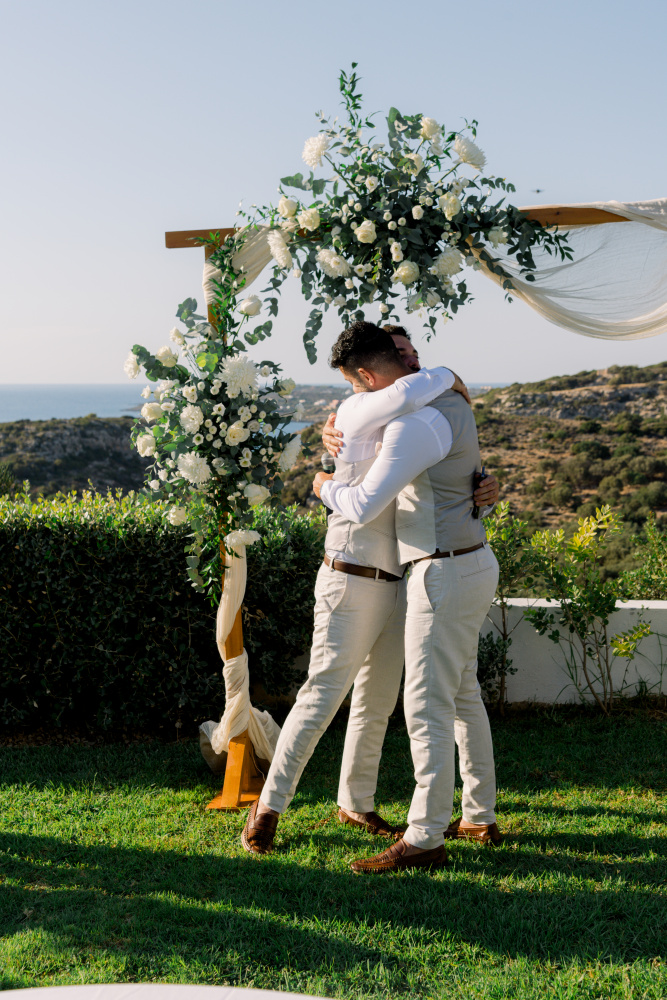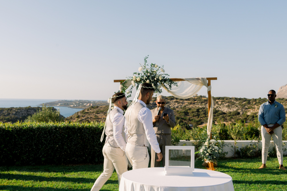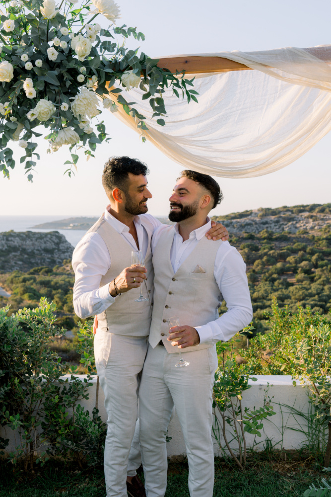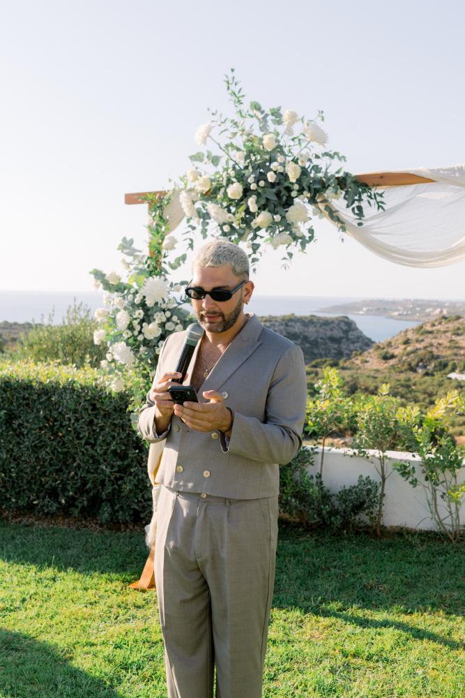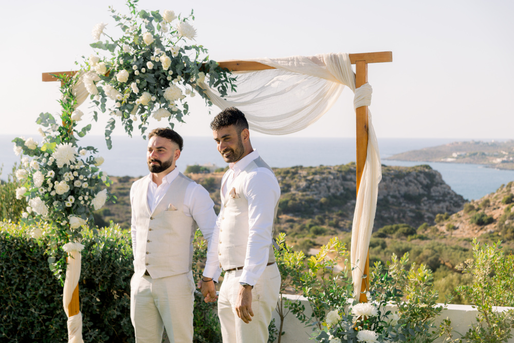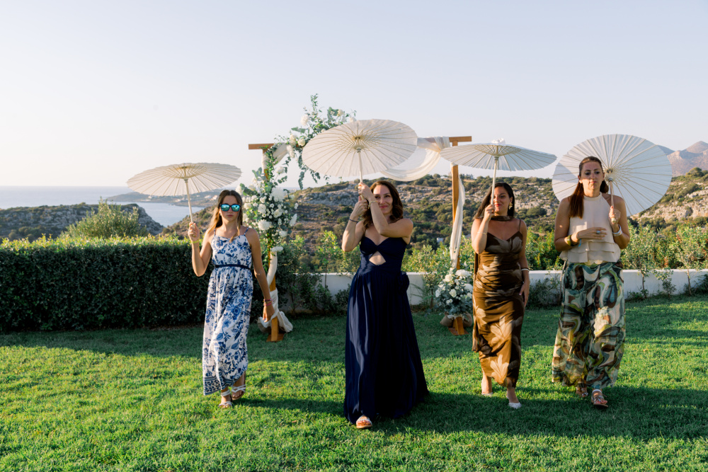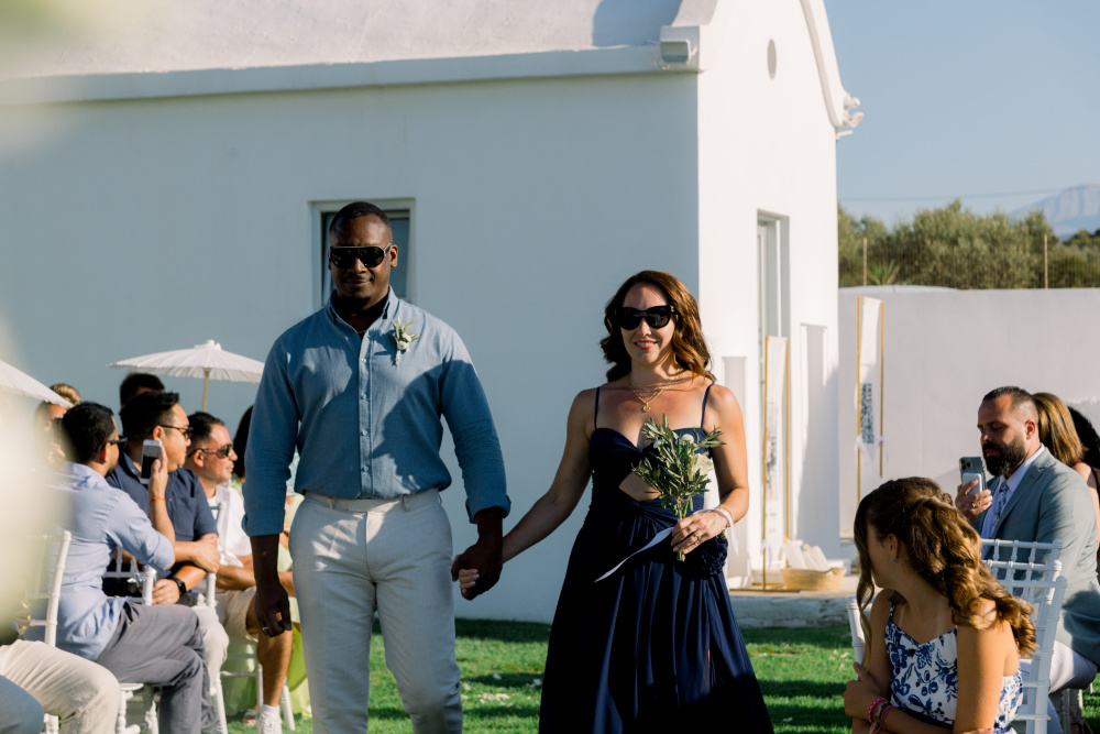 Their ceremony unfolded at Ktima Reveli, framed by sweeping sea views and soft coastal light. Under an elegant floral arch,