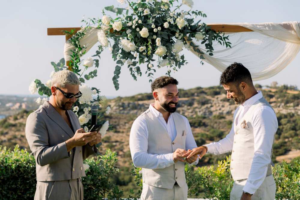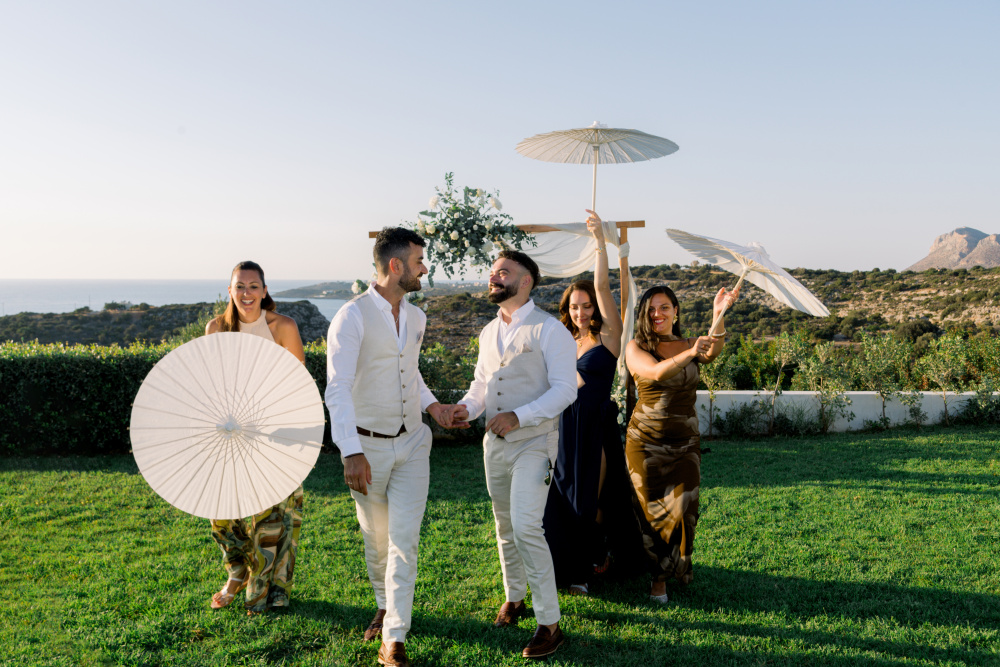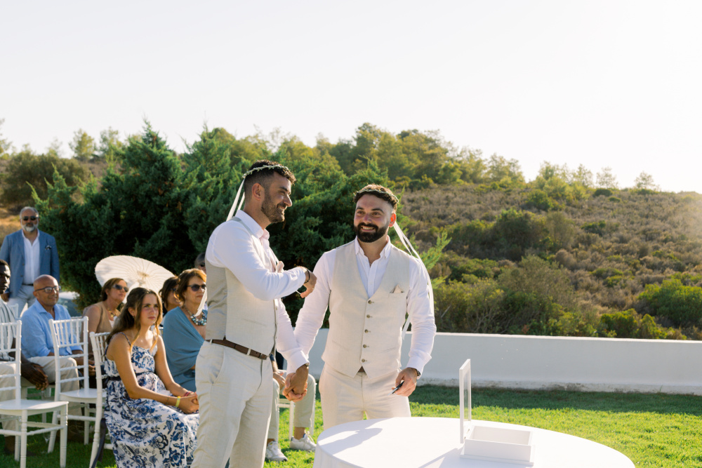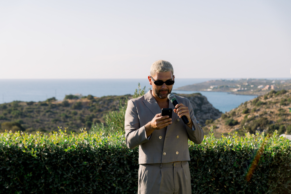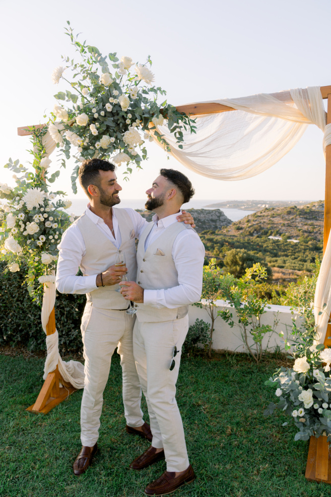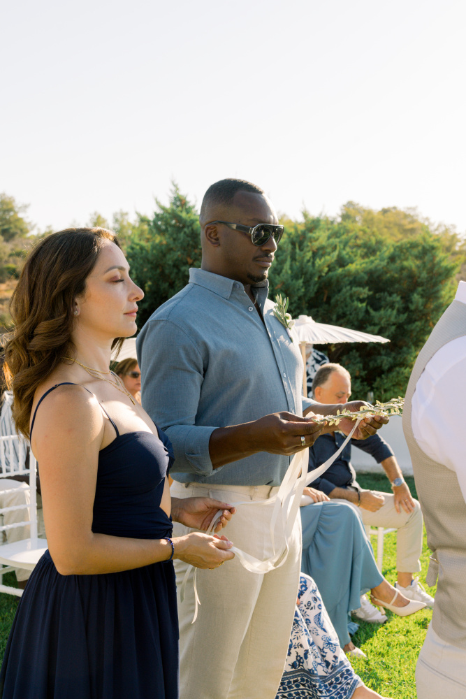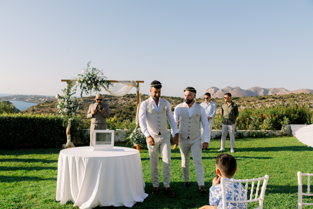 Their ceremony unfolded at Ktima Reveli, framed by sweeping sea views and soft coastal light. Under an elegant floral arch,