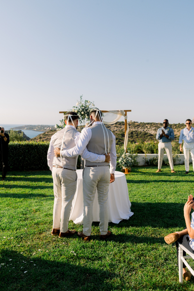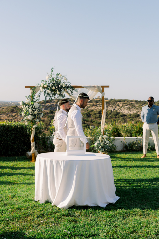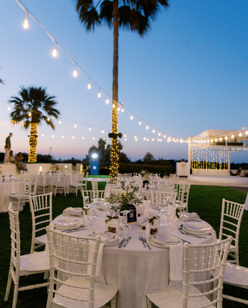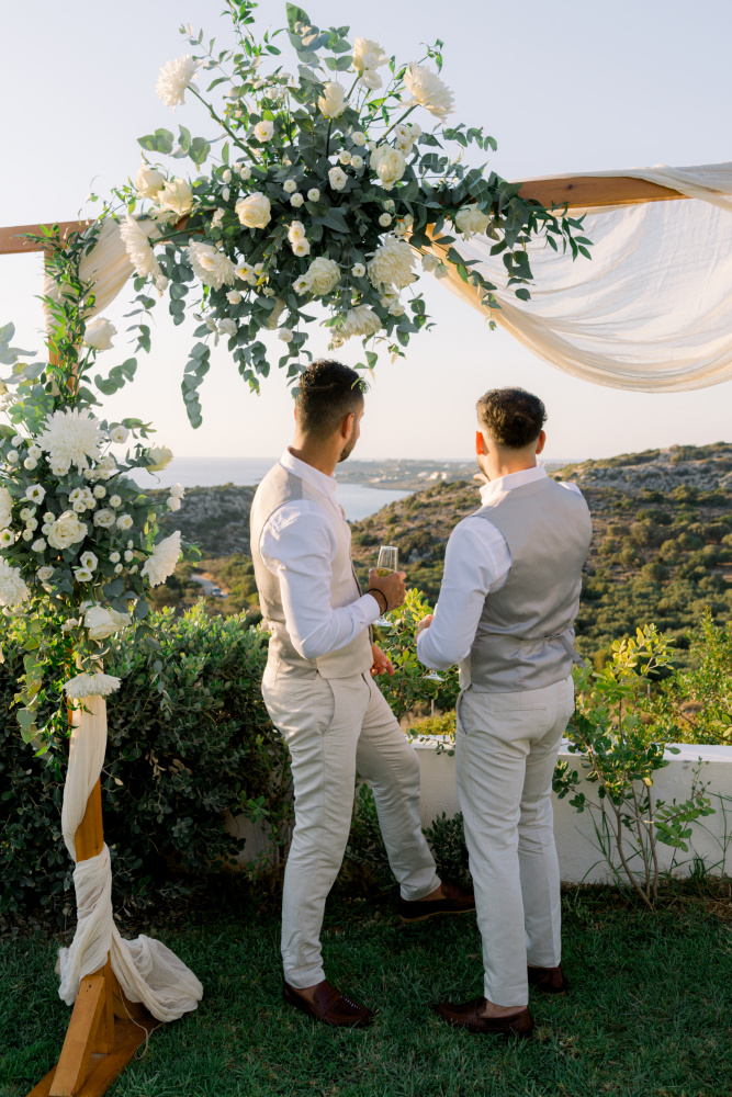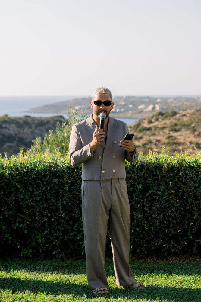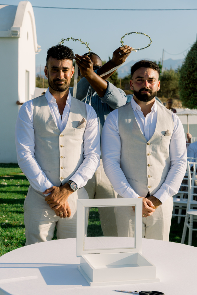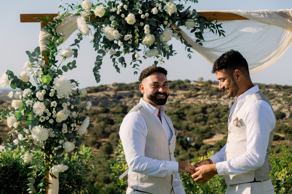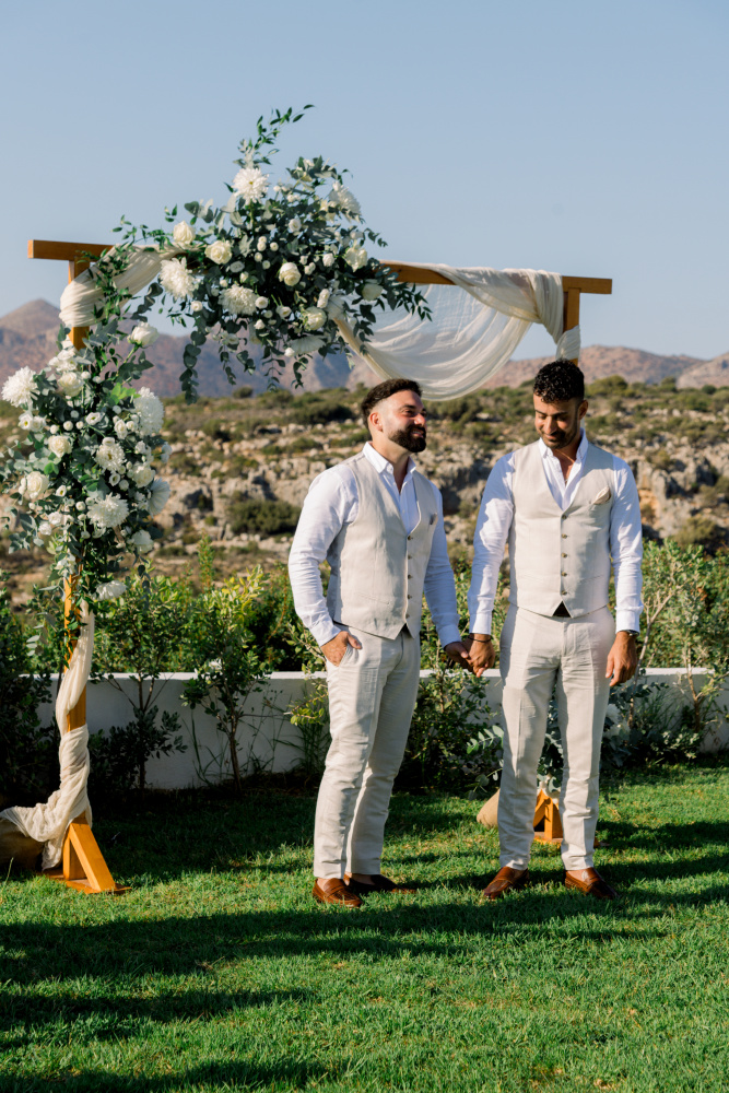 Their ceremony unfolded at Ktima Reveli, framed by sweeping sea views and soft coastal light. Under an elegant floral arch,