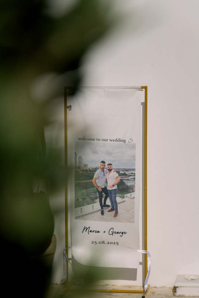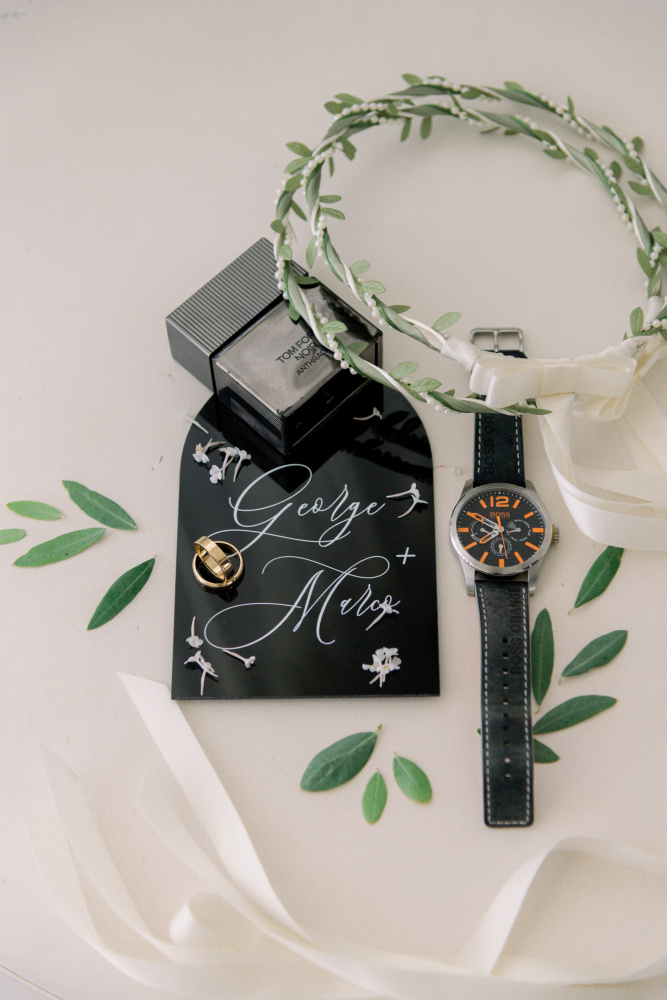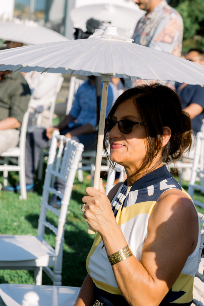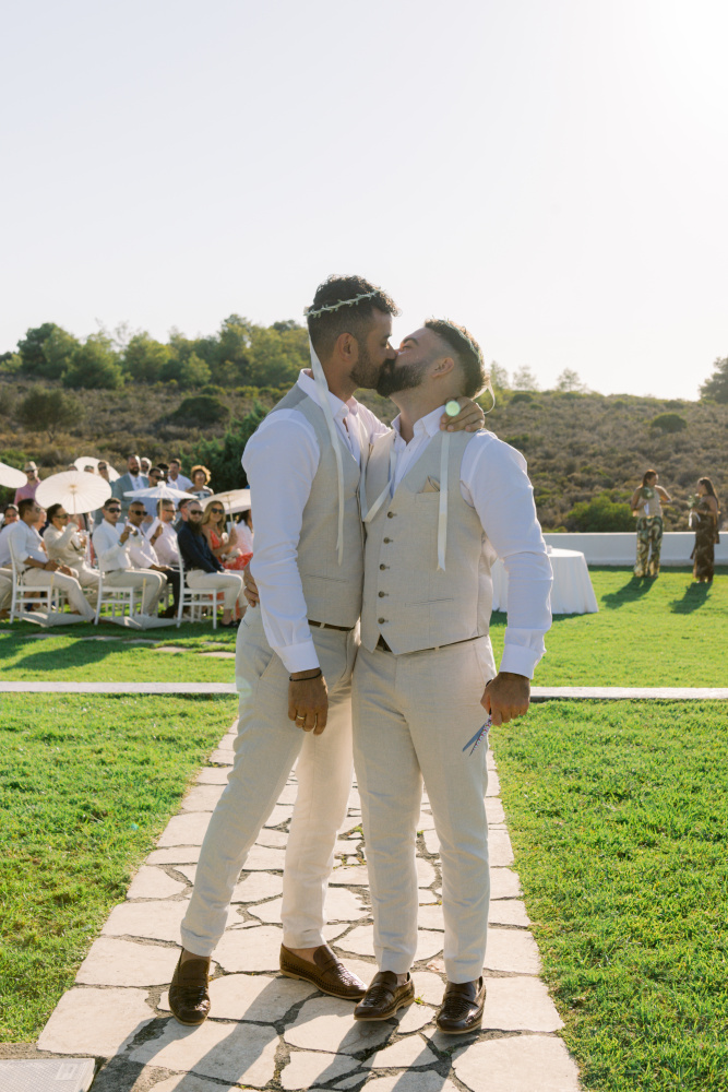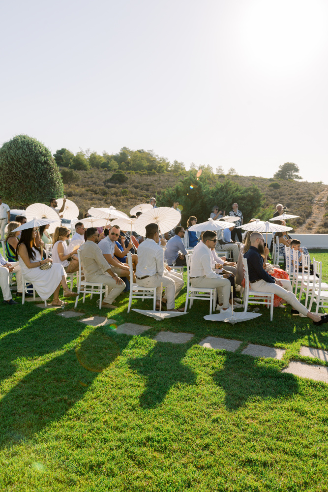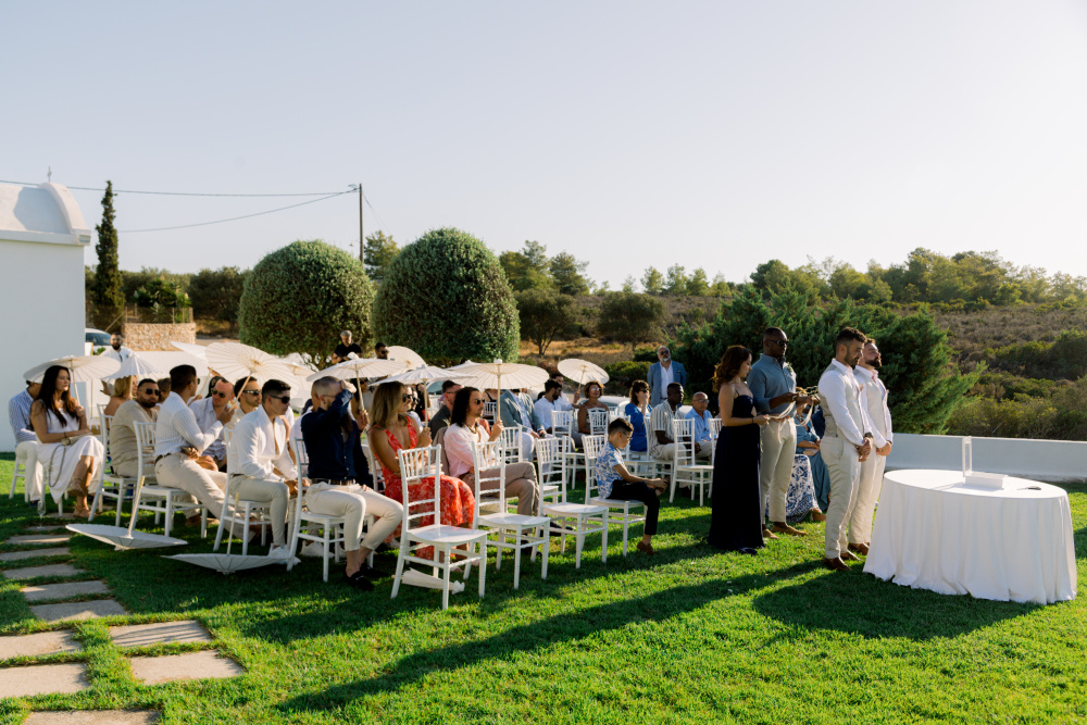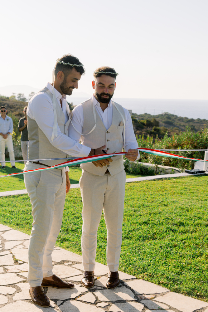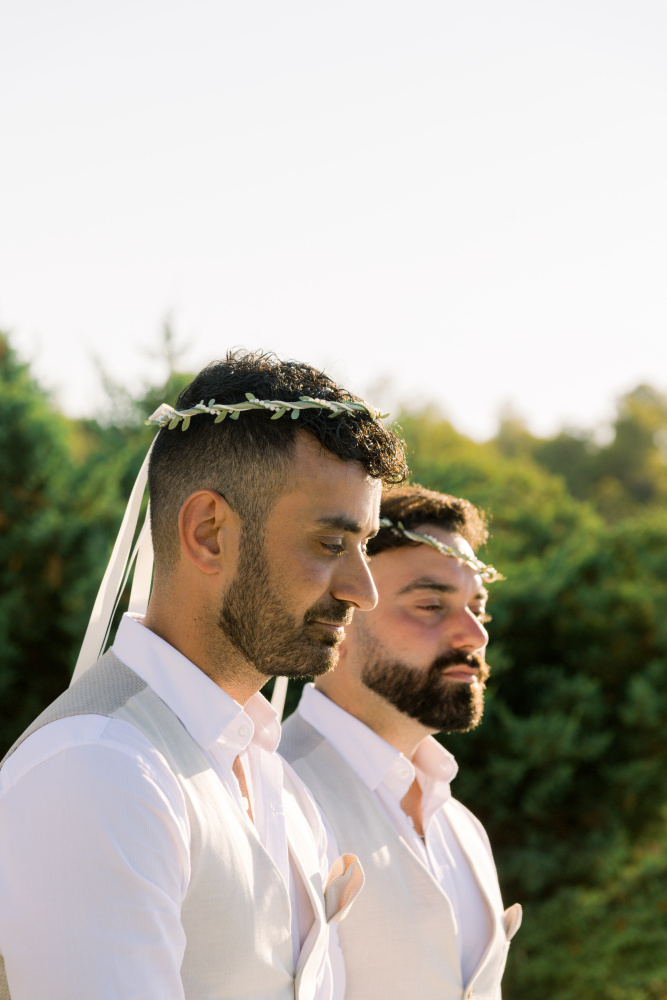 Their ceremony unfolded at Ktima Reveli, framed by sweeping sea views and soft coastal light. Under an elegant floral arch,