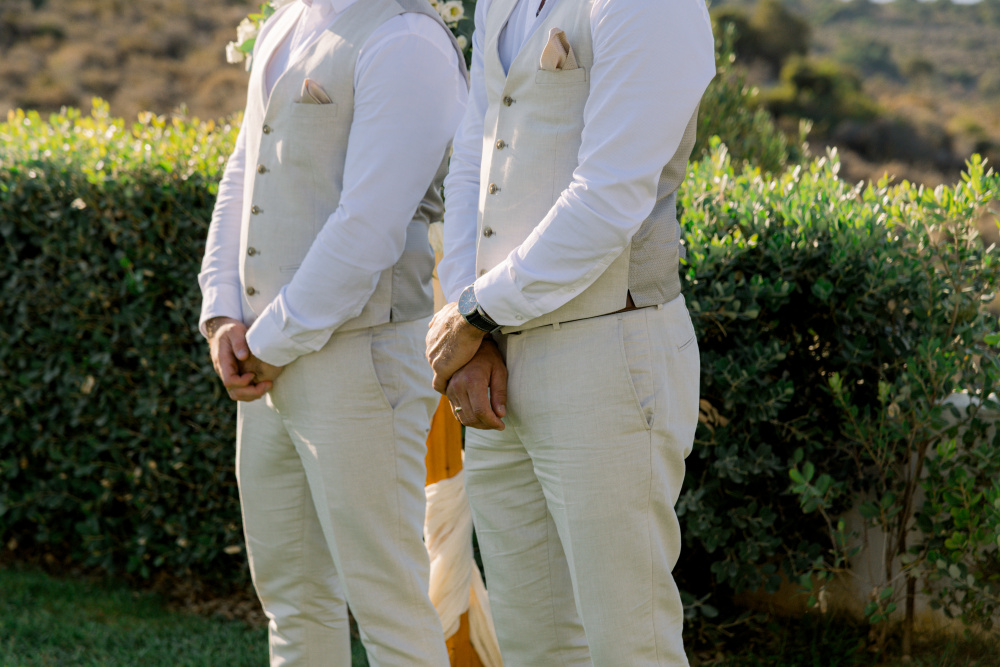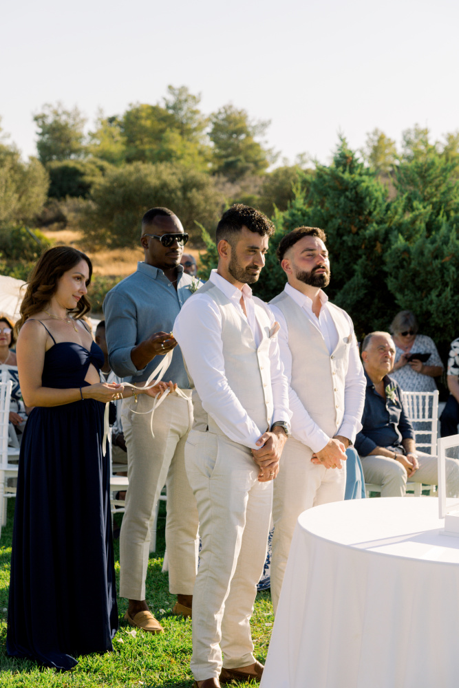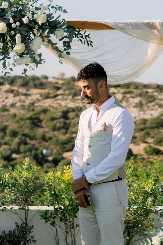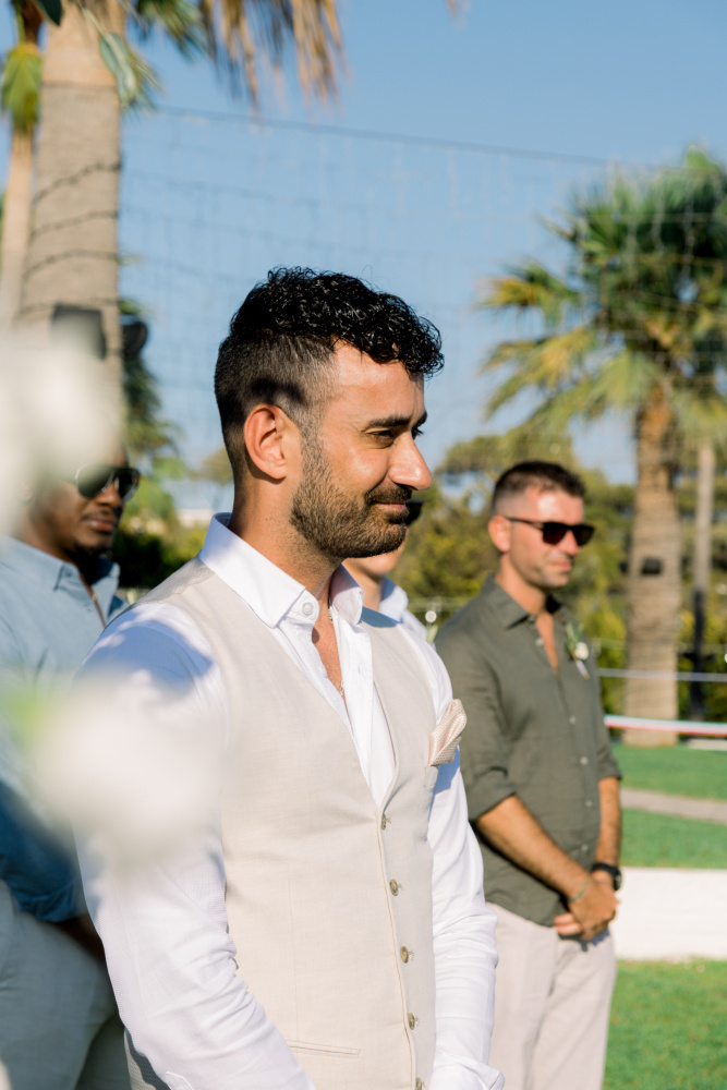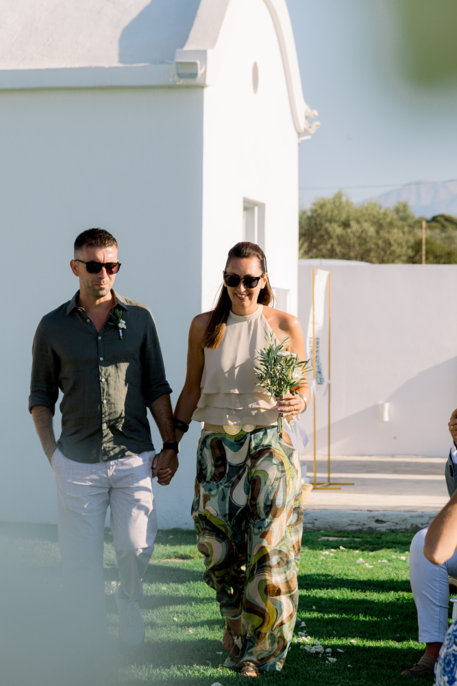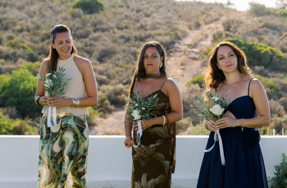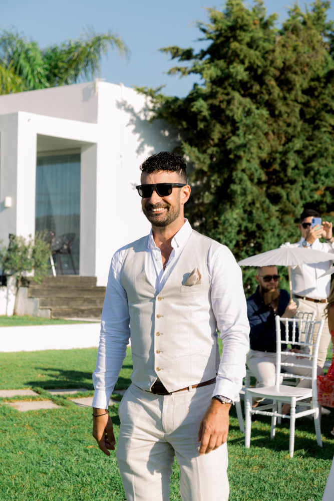 dressed in understated ivory tones, they stood hand in hand as the breeze carried gentle whispers from the shoreline. Every detail reflected a balance of simplicity and sophistication: natural textures, warm Mediterranean hues, and an atmosphere that felt both intimate and effortlessly refined.